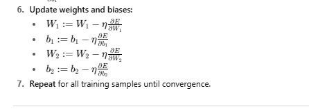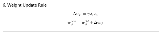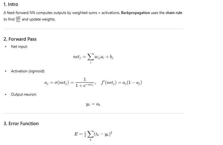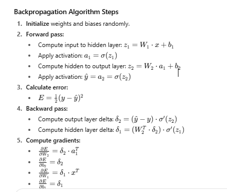 Backpropagation is a fundamental algorithm used to train artificial neural networks by minimizing the error between the networkâs predicted output and the actual target output. It works by performing a forward pass to compute the outputs based on current weights and biases, then calculating the error using a loss function such as mean squared error. The algorithm then propagates this error backward through the network, layer by layer, using the chain rule of calculus to compute gradients of the loss with respect to each weight and bias. These gradients indicate how to adjust the parameters to reduce the error. By iteratively updating the weights and biases in the opposite direction of the gradientsâscaled by a learning rateâbackpropagation enables the network to learn patterns in the training data and improve its predictions over time.